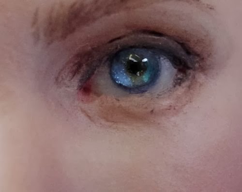 7. Con una mano muy firme, entre la pupila y en el iris, formamos unas pequeñas "rayitas" como las que existen en el iris de los ojos,nos podemos fijar de fotos. No pintar los detalles de seguido,dejar secar un poco la pintura anterior.